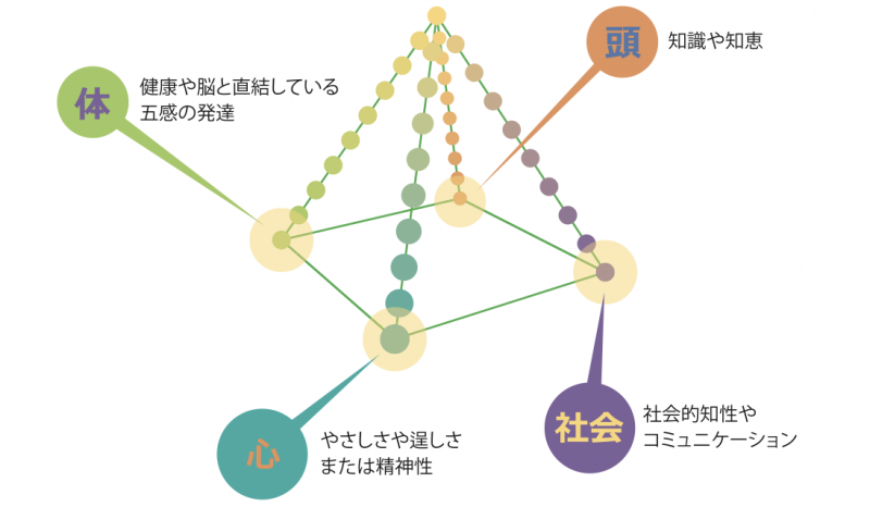 IBEAでは、4つのエレメンツ「頭」「体」「心」「社会」を土台として「幅広い豊かな教育」の形が作られていくと考えています。